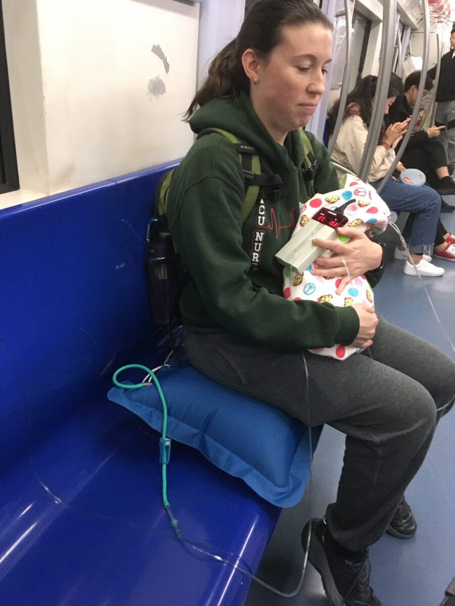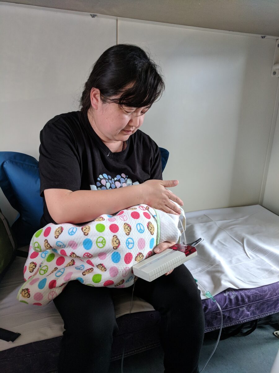 We quickly purchased train tickets to get baby Xin back to Beijing where we could admit her to a hospital that would be able to help her. We suspected that she had some pretty significant medical problems based on her yellow skin and some peeling on her hands and feet, not to mention her lung issues and prematurity. The train ride is 8.5 hours between the Little Flower project in Inner Mongolia and Beijing. It was March and very cold still so Xin needed to be skin to skin for the majority of the train ride and was fed via NG tube every hour. She was also very dependent on oxygen so we had to get special permission from the train company to bring our oxygen concentrator on board. We then used portable oxygen bags to keep her stable on the subway ride and walk from the train station to the hospital. We made it to the ICU in Beijing and she was admitted.